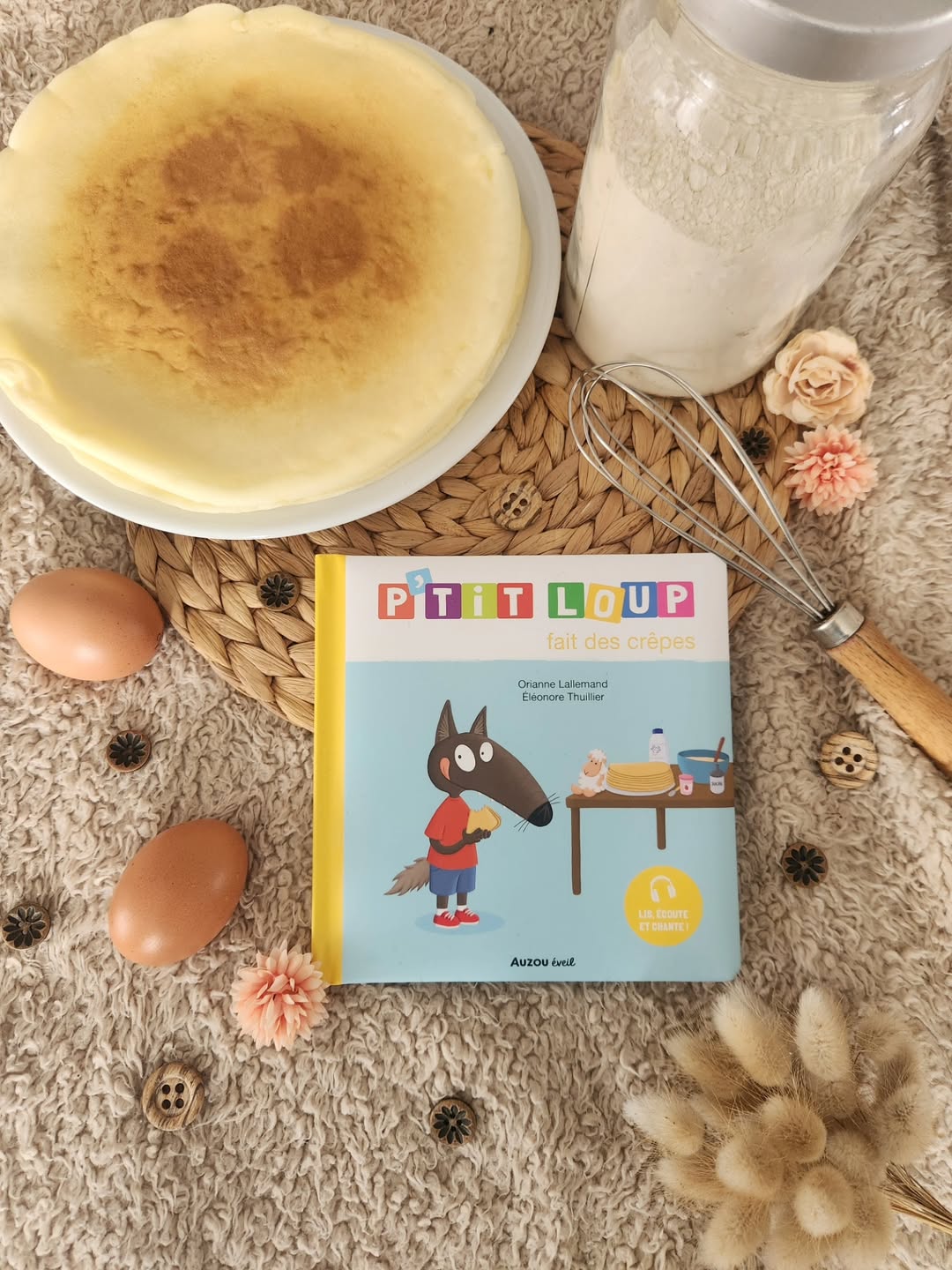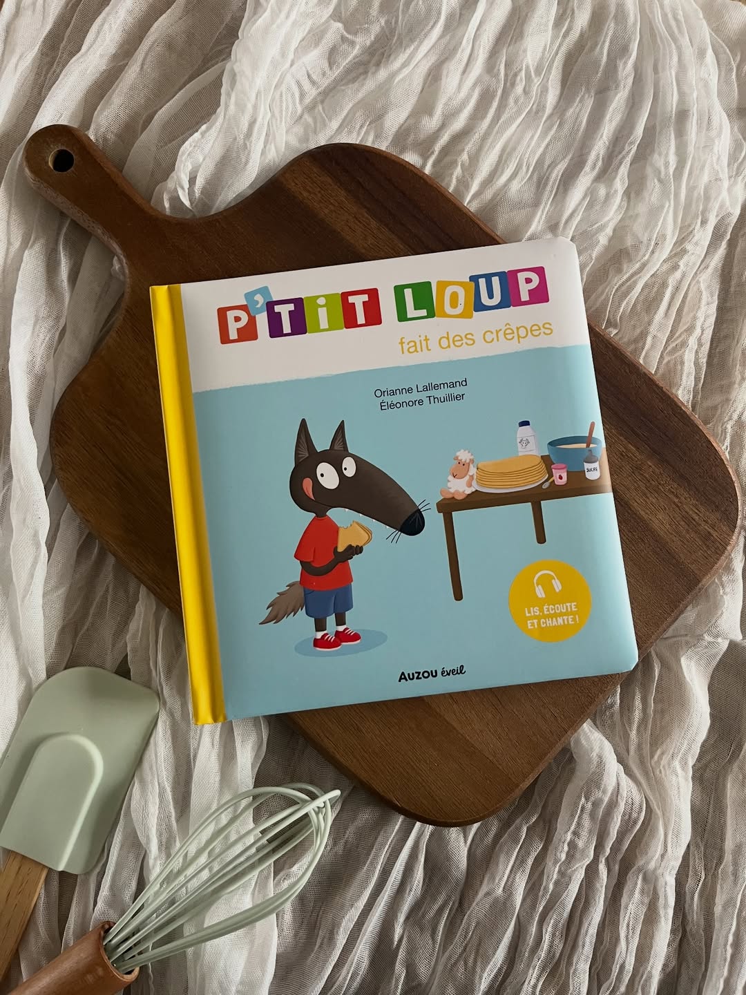 Mamaaaaaaan on veux faire des « kièpes » comme P’tit Loup ! Merci P’tit Loup de nous avoir soufflé l’idée d’une petite partie crêpes en famille. Le livre est juste génial déjà parce qu’ici on adore P’tit Loup, mais il existe une version audio de l’histoire + une chanson en bonus ! (inutile de vous dire que la chanson reste en tête et que les enfants en redemandent)